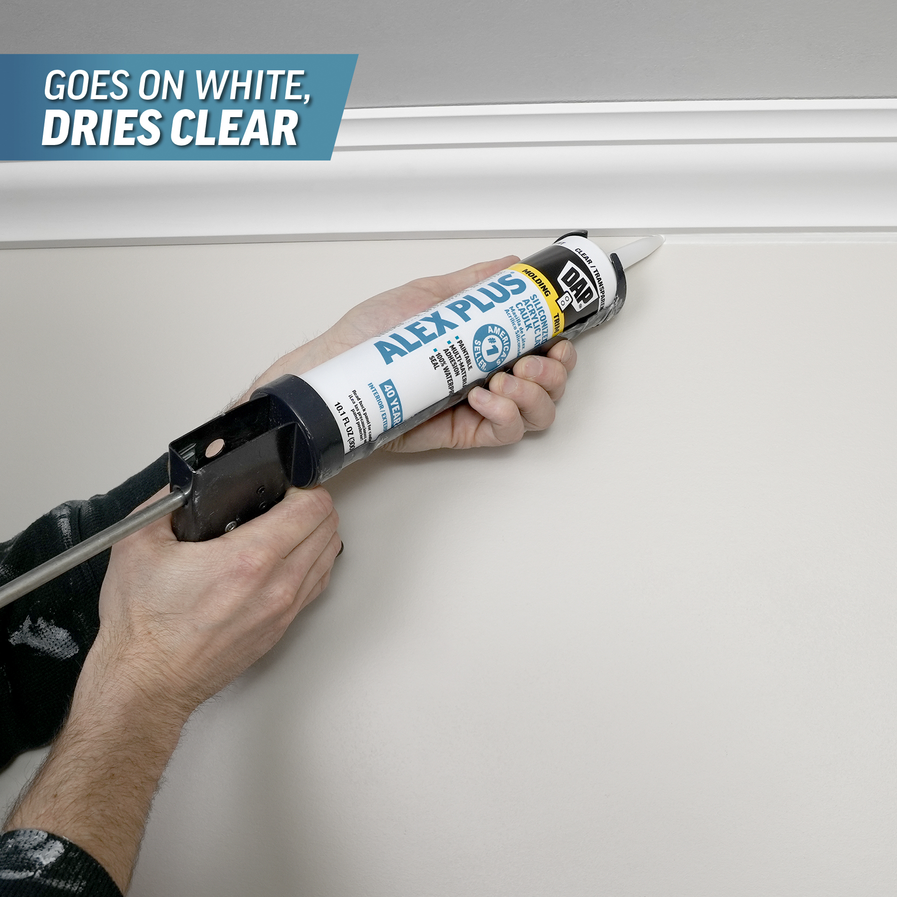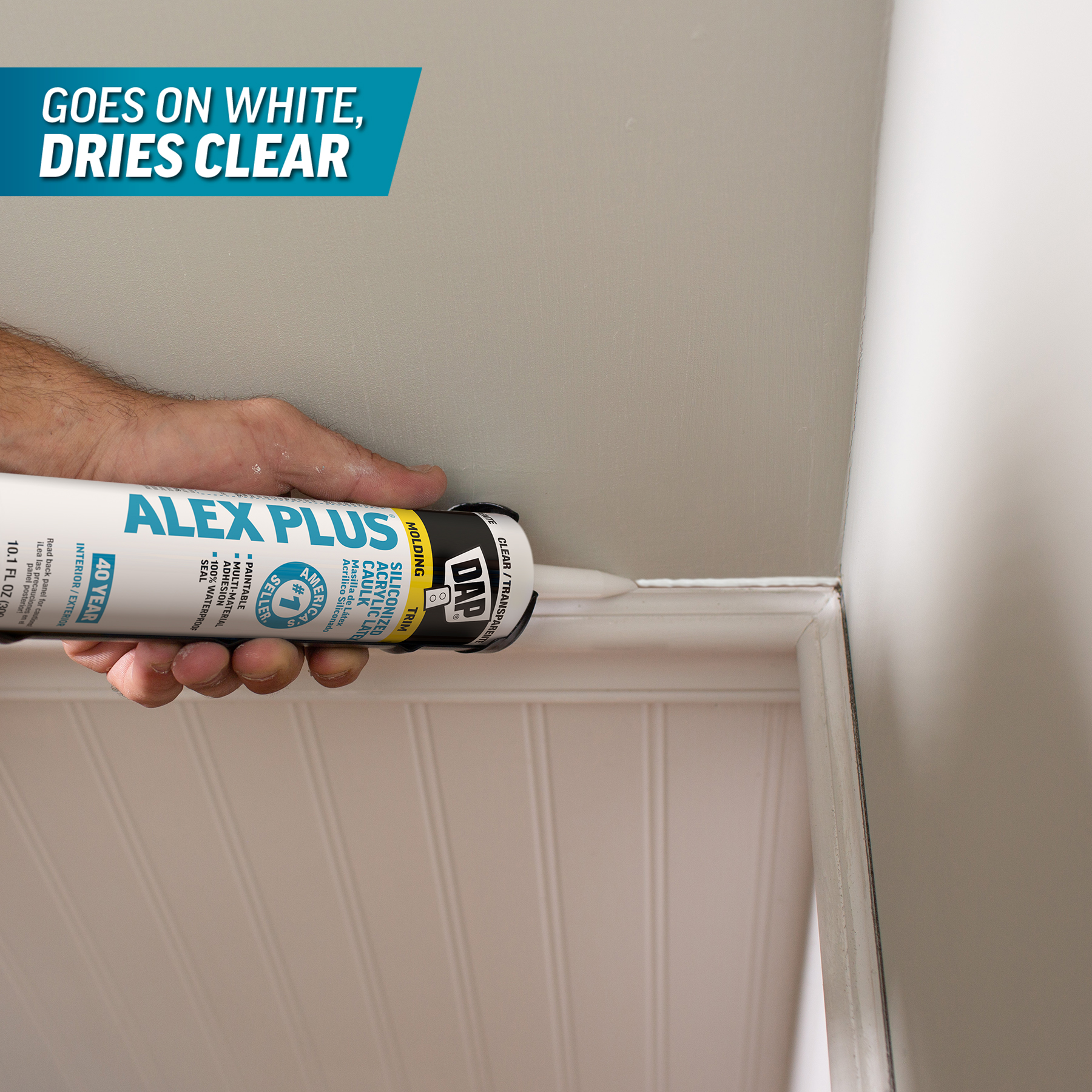 DAP® ALEX PLUS® is a latex-based formulation so it goes on white and dries clear in 7 days, depending on joint depth, temperature and humidity.