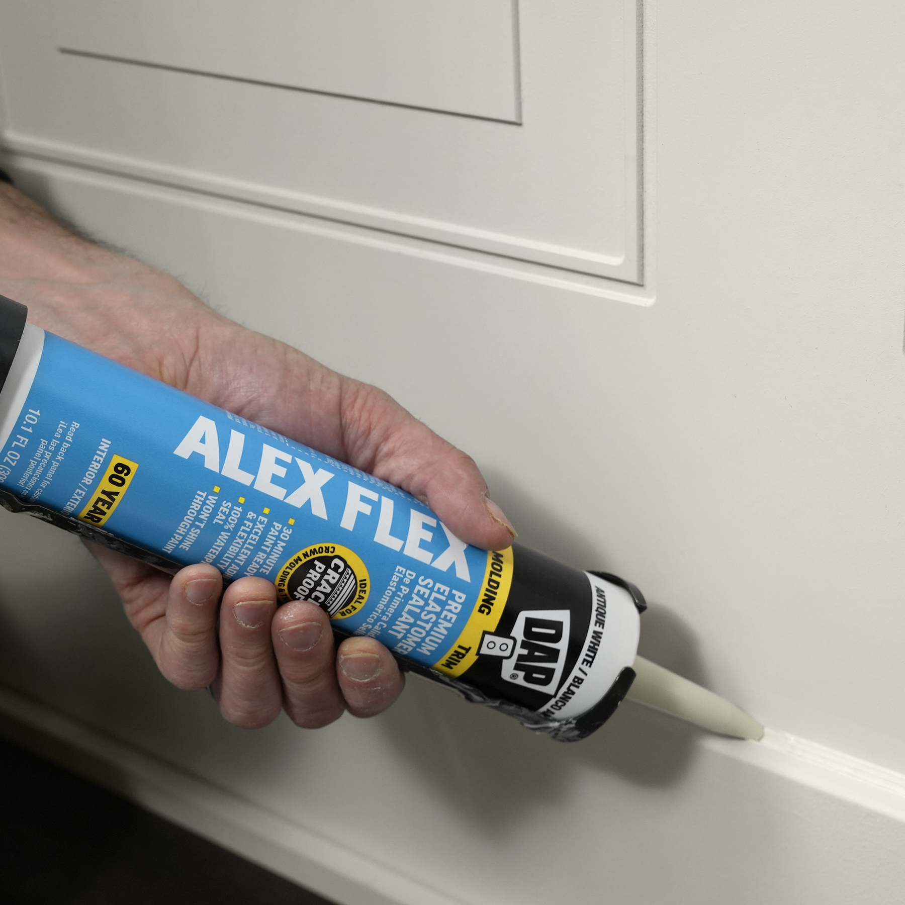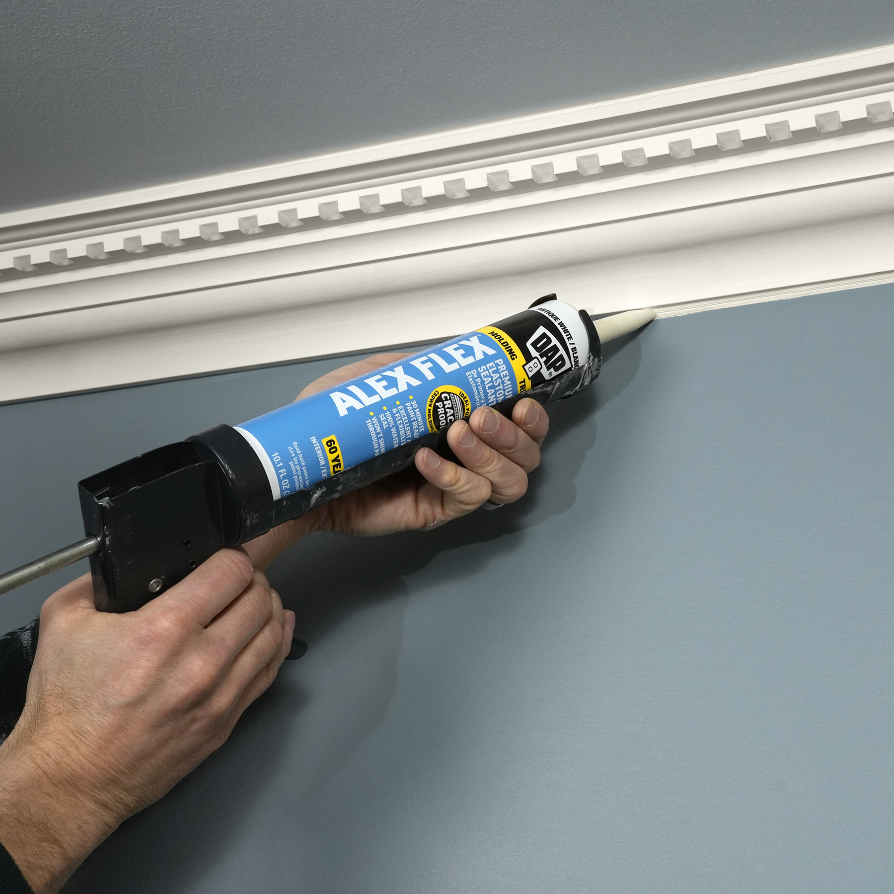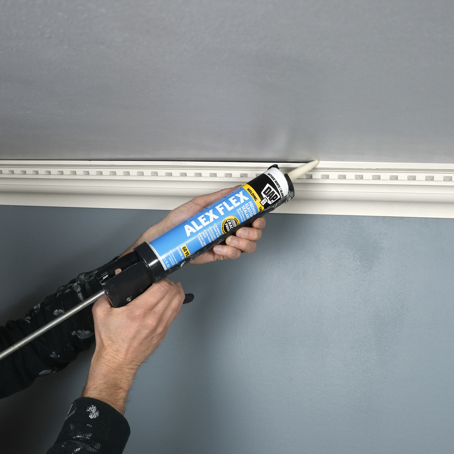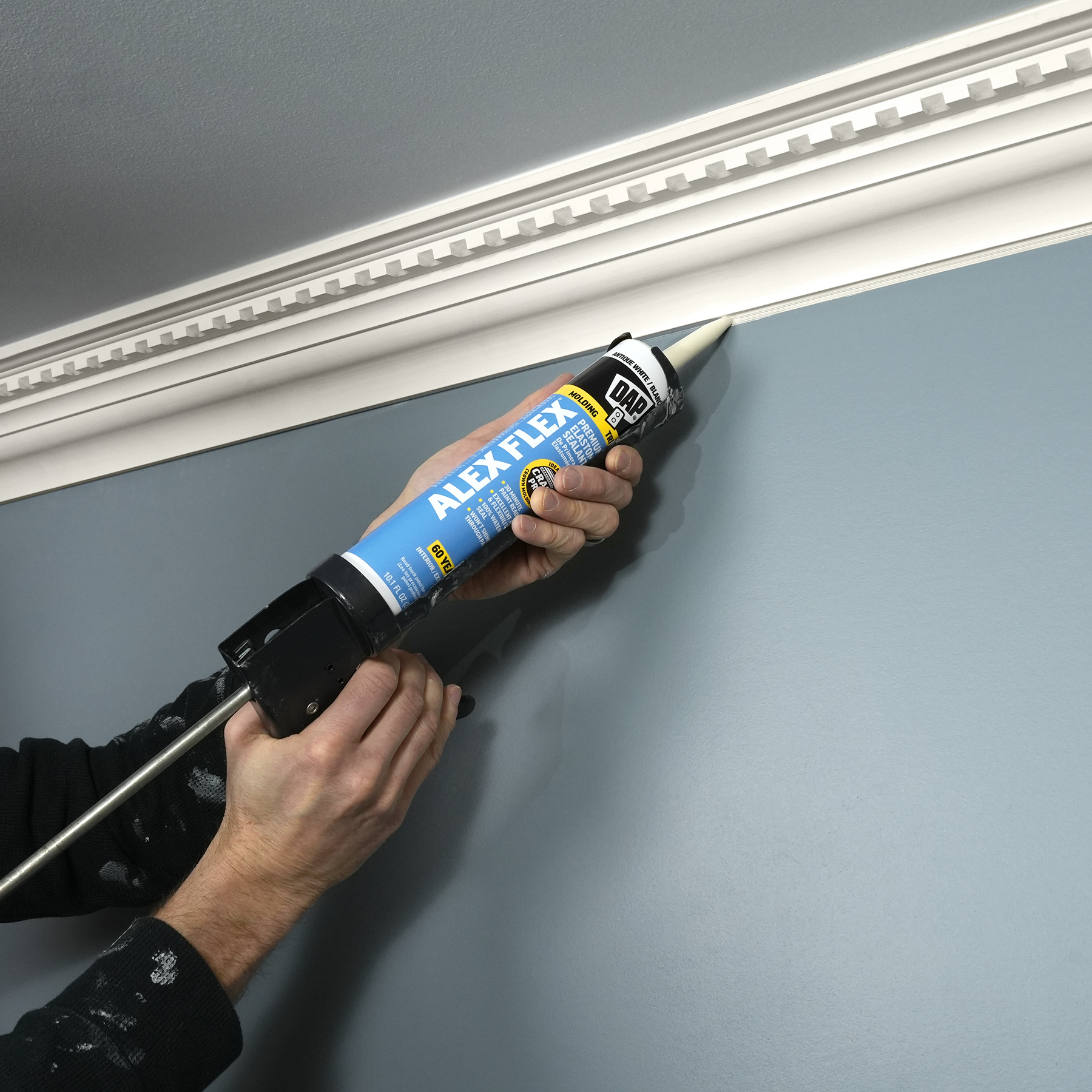 Sealing molding and trim can be a tricky project if the wrong sealant is used. Multi-piece crown molding can have up to five or more moving parts that must be sealed. Seasonal changes can cause wood trim to expand and contract, stressing seams year round. DAP® ALEX FLEX® provides maximum flexibility and adhesion for a crack proof seal, as well as fast paintability and no paint shiners, making it ideal for molding and trim projects.
