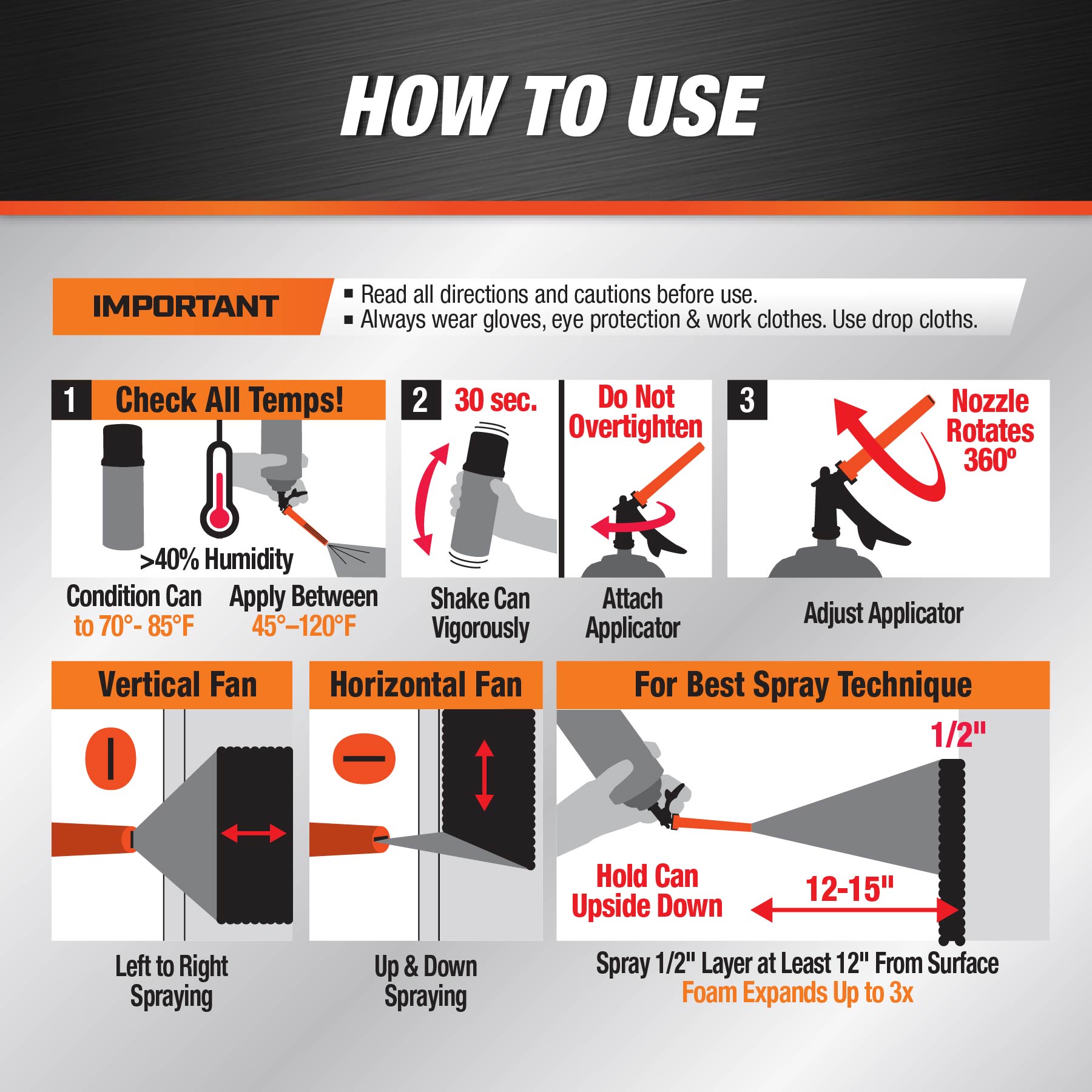Black Insulating Foam with Widespray Applicator is a high-performance, one-component polyurethane foam designed for sealing, insulating, and soundproofing. Featuring a patent-pending adjustable nozzle for horizontal and vertical spray patterns, it delivers precision and versatility for small projects and touch-ups. The UV-resistant black finish ensures long-lasting durability in both indoor and outdoor environments. Ideal for use in rim joists, sheds, RVs, and deer blinds, it meets Class A fire resistance standards and enhances R-value.