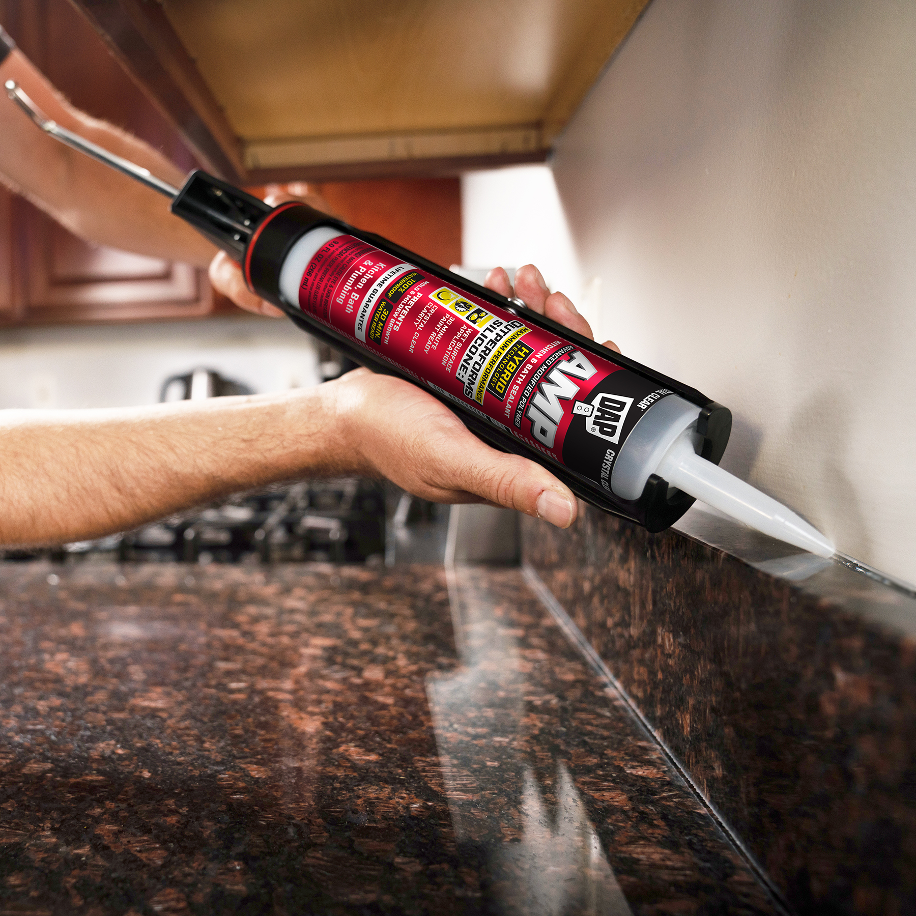 AMP Kitchen and Bath White and Crystal Clear can be exposed to water in just 30 minutes when applied with a bead size maximum of 3/16” in a 65°F and humidity of 50% minimum. AMP will not wash out or become damaged by permanent water marks, eliminating the worry of a ruined caulk job and having to reapply. This is significantly shorter compared to other sealants which typically require anywhere from 4 to 24 hours of wait time before exposure to water.
