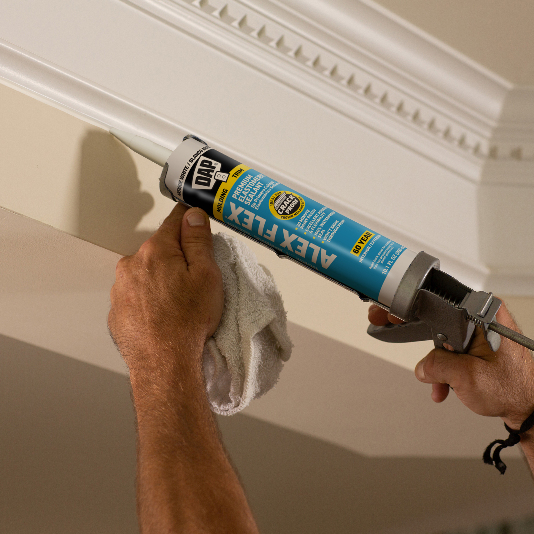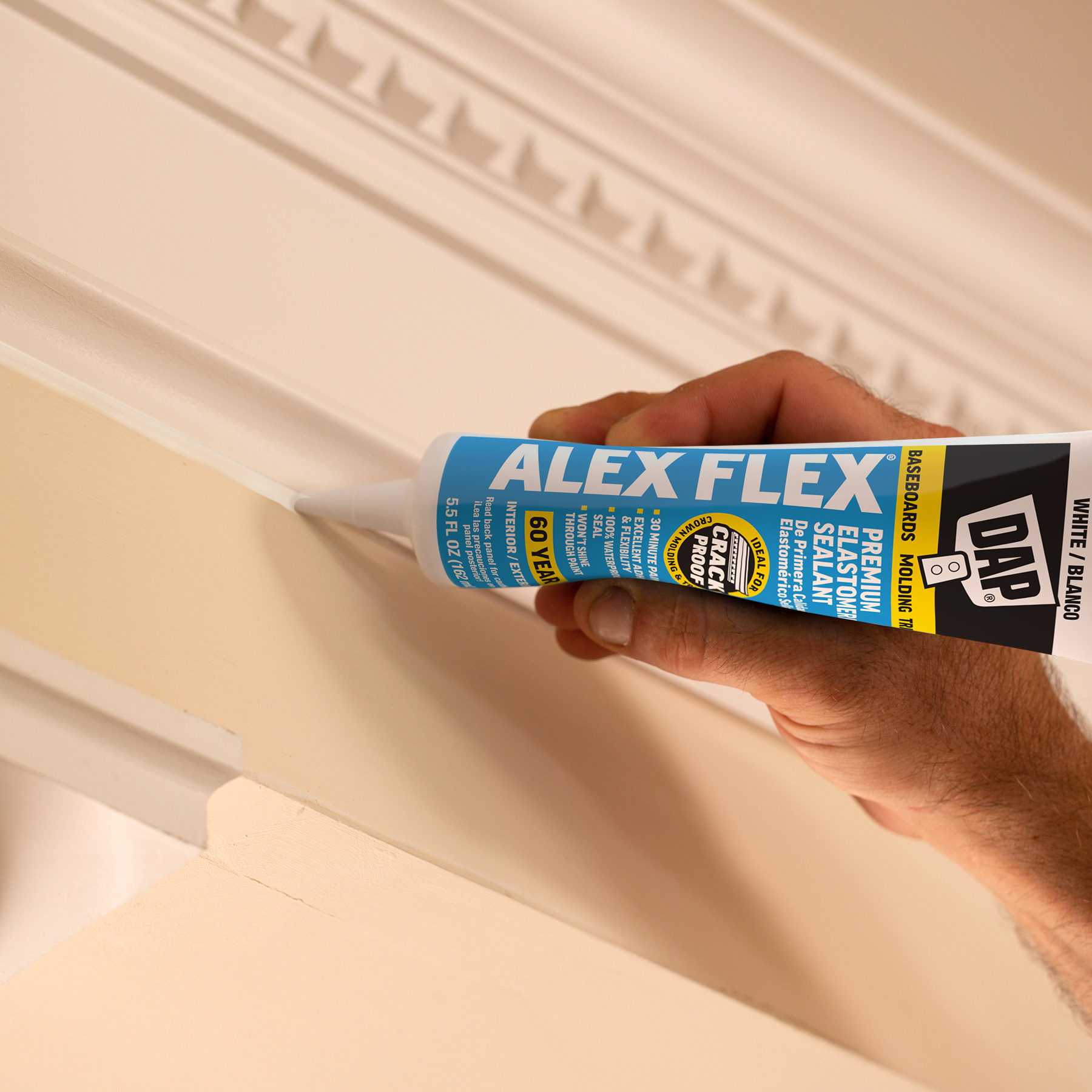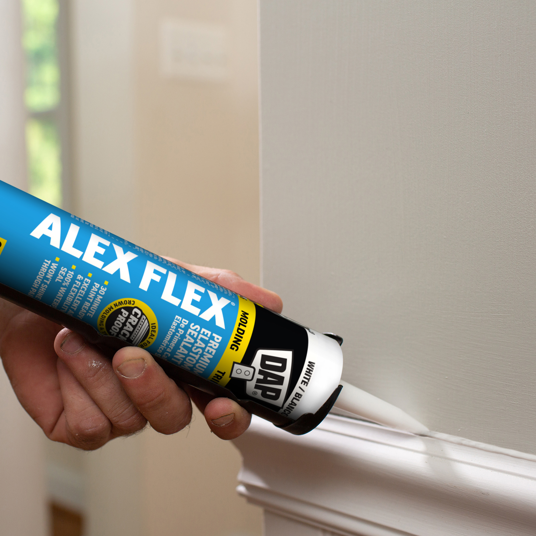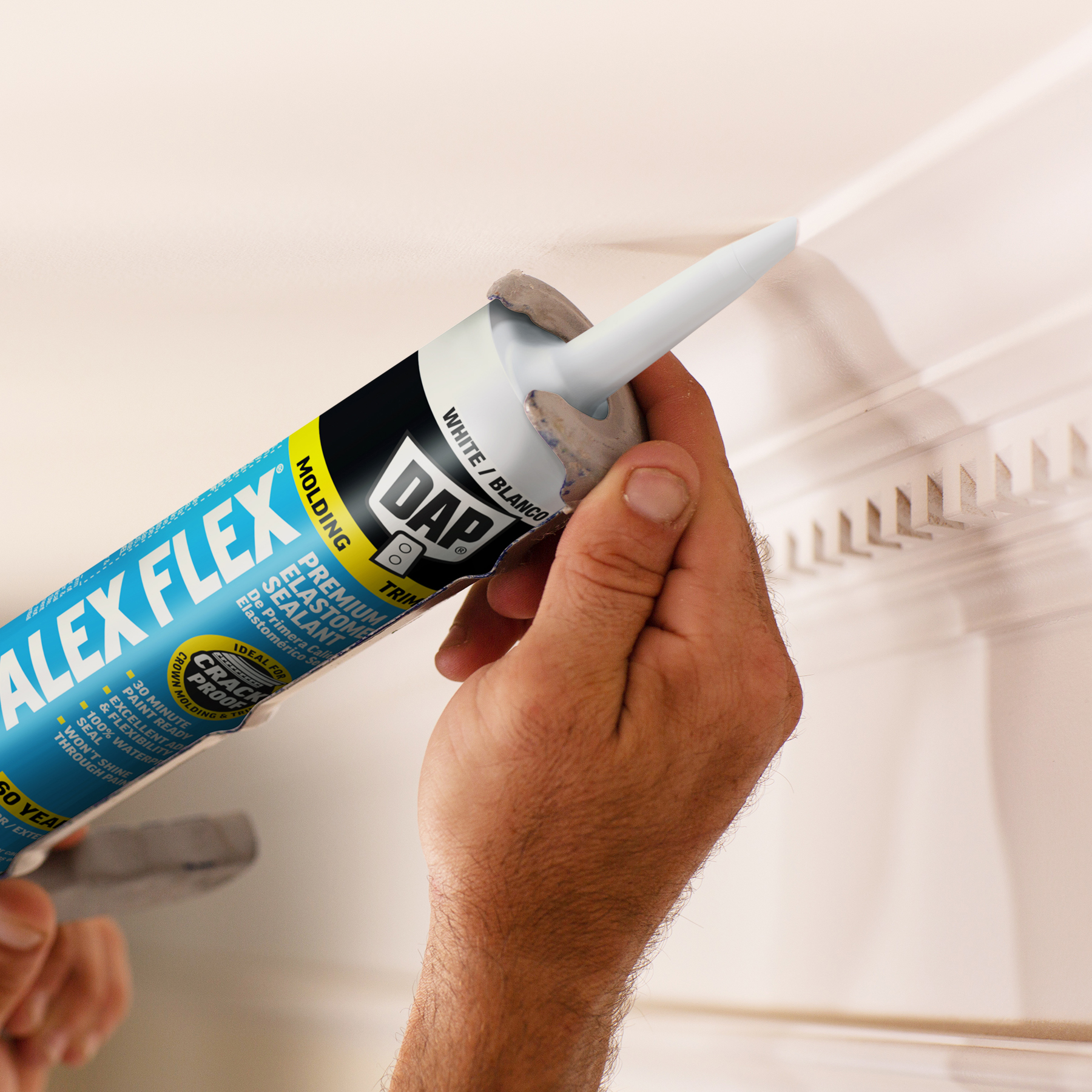 Sealing molding and trim can be a tricky project if the wrong sealant is used. Multi-piece crown molding can have up to five or more moving parts that must be sealed. Seasonal changes can cause wood trim to expand and contract, stressing seams year round. DAP® ALEX FLEX® provides maximum flexibility and adhesion for a crack proof seal, as well as fast paintability and no paint shiners, making it ideal for molding and trim projects.