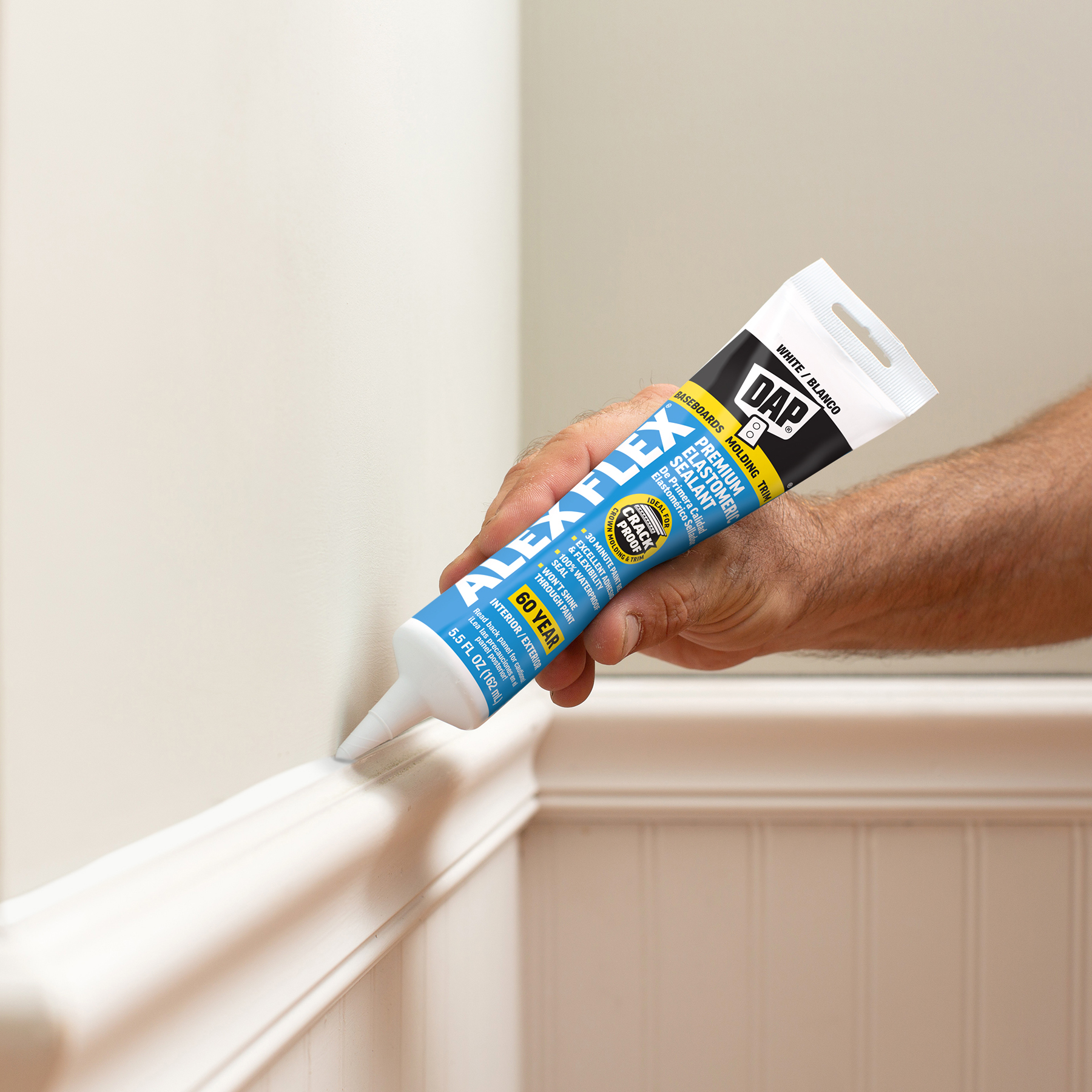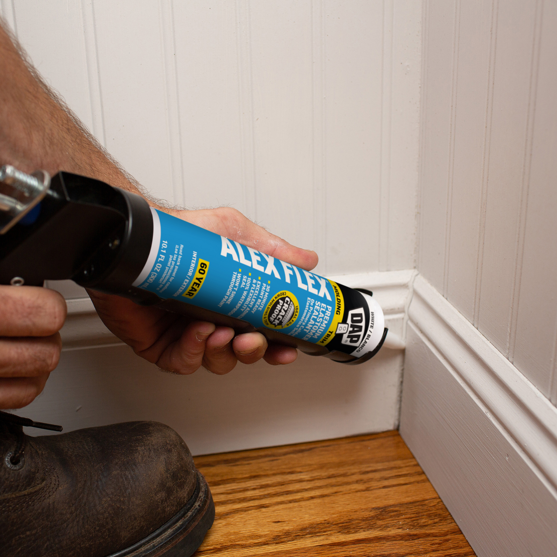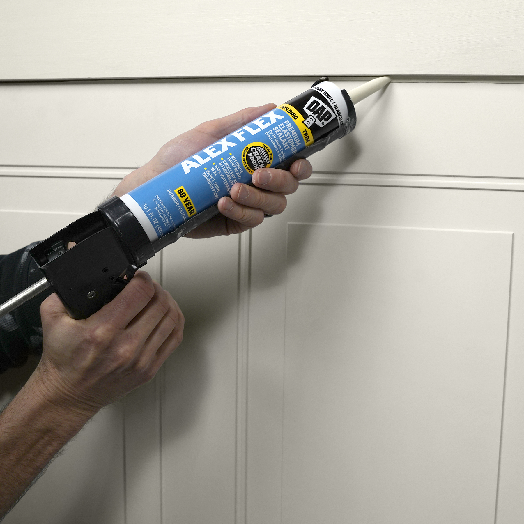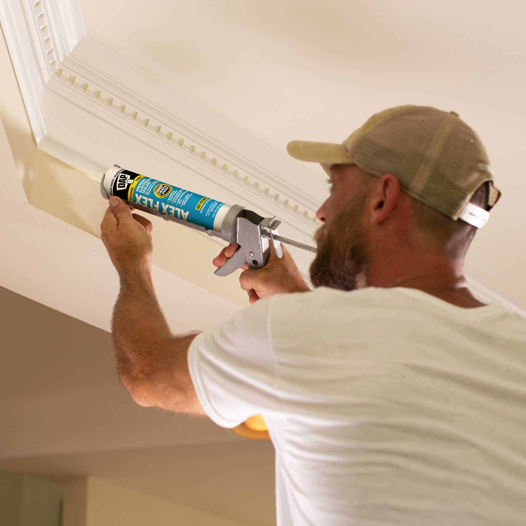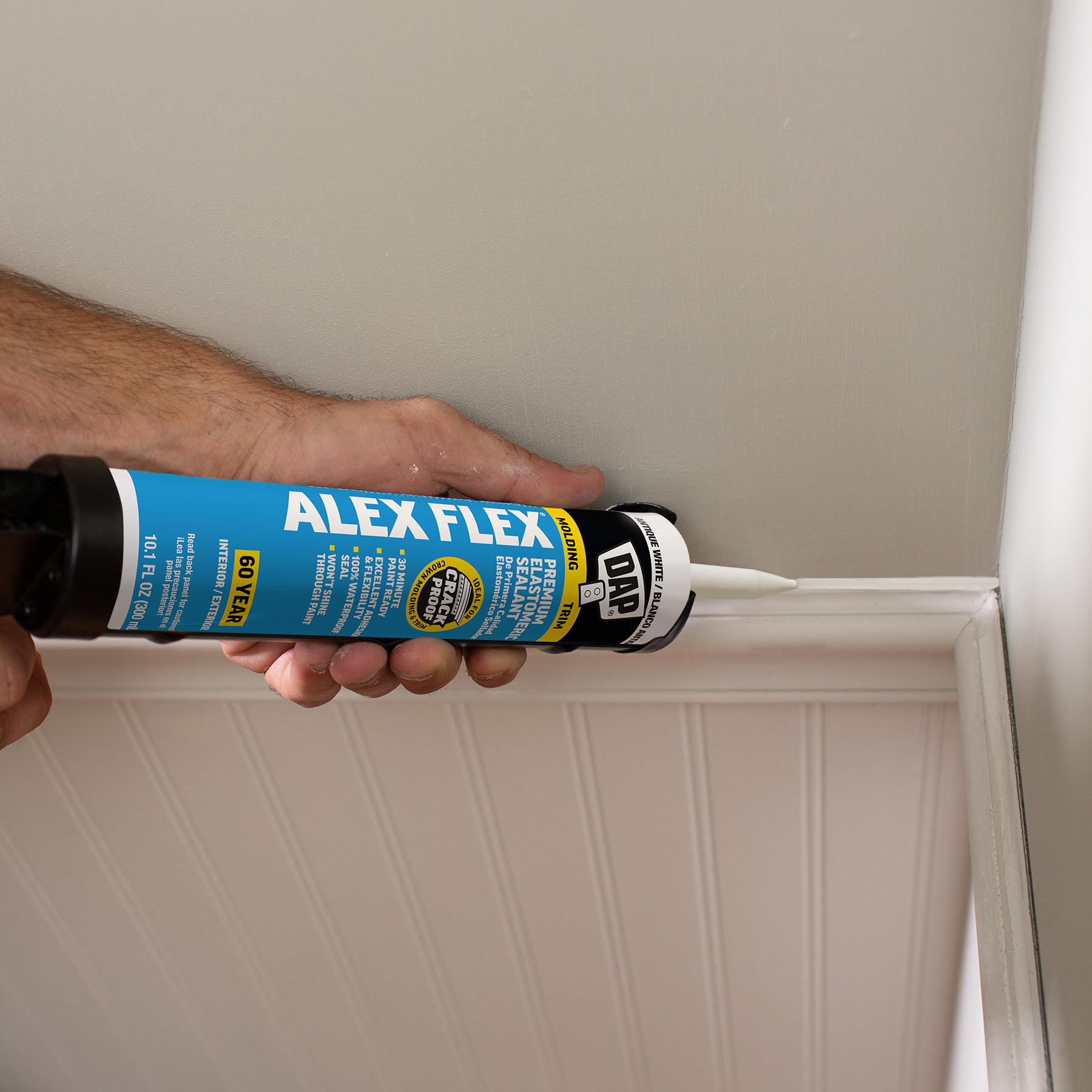 Sealing molding and trim can be a tricky project if the wrong sealant is used. Multi-piece crown molding can have up to five or more moving parts that must be sealed. Seasonal changes can cause wood trim to expand and contract, stressing seams year round. DAP® ALEX FLEX® provides maximum flexibility and adhesion for a crack proof seal, as well as fast paintability and no paint shiners, making it ideal for molding and trim projects.
