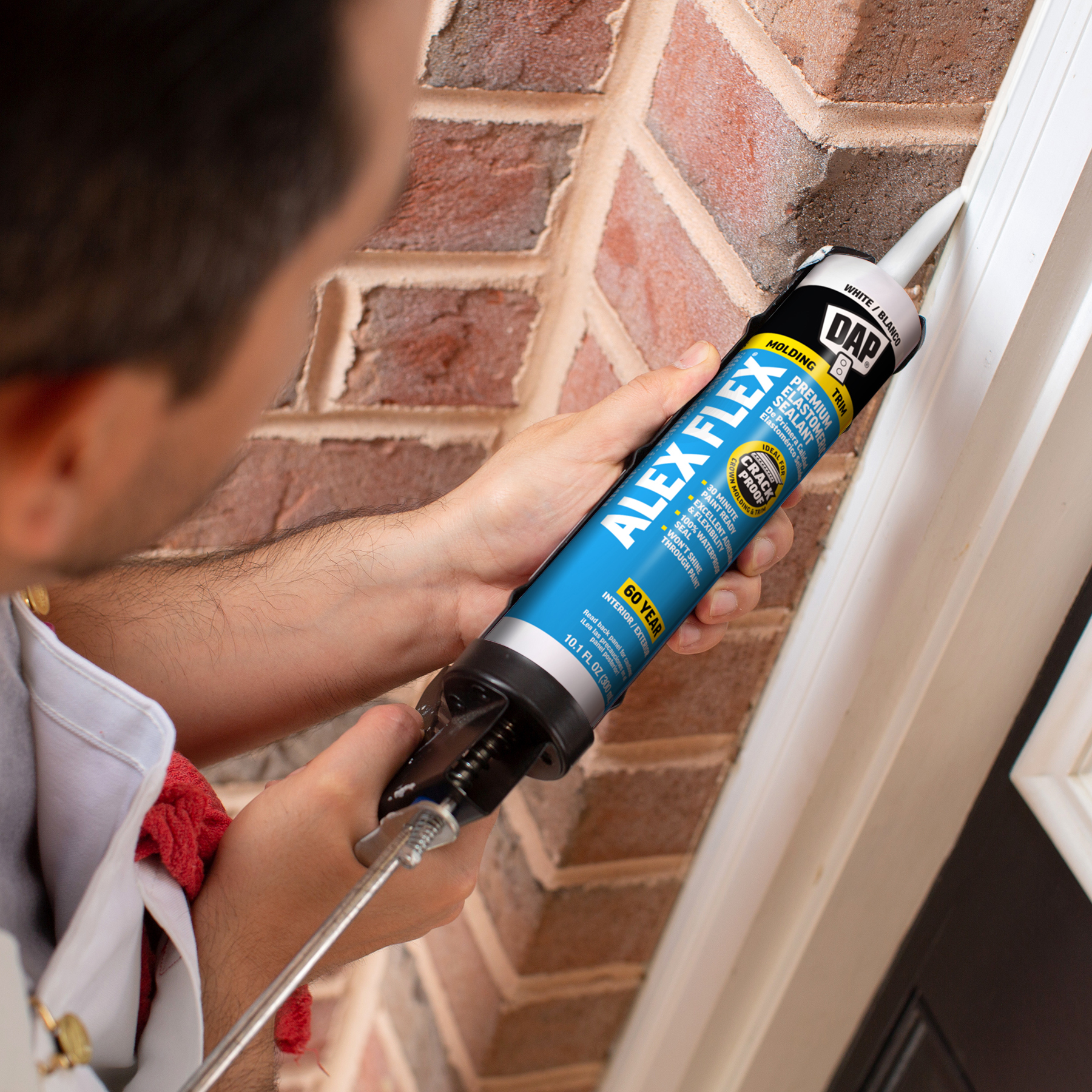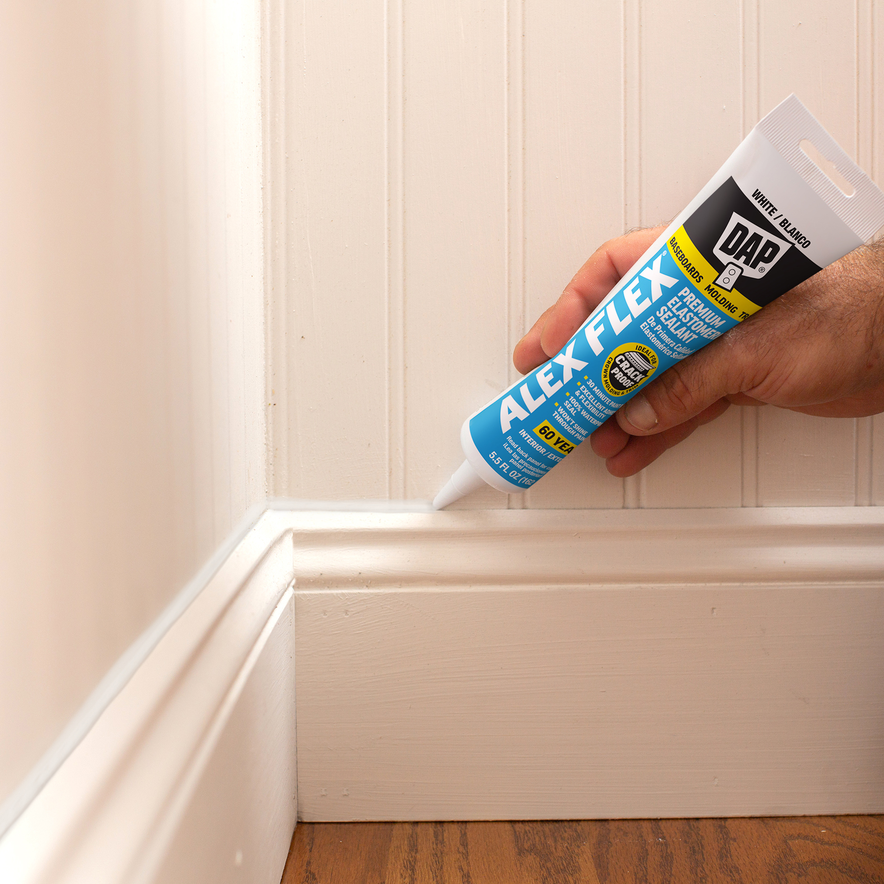 DAP® ALEX® acrylic latex caulks are ideal for filling and sealing gaps and cracks around window and door frames, molding, trim, baseboards, corner joints, and more. They have excellent adhesion to painted and unpainted wood, aluminum, vinyl, metal, brick, drywall, concrete and masonry.